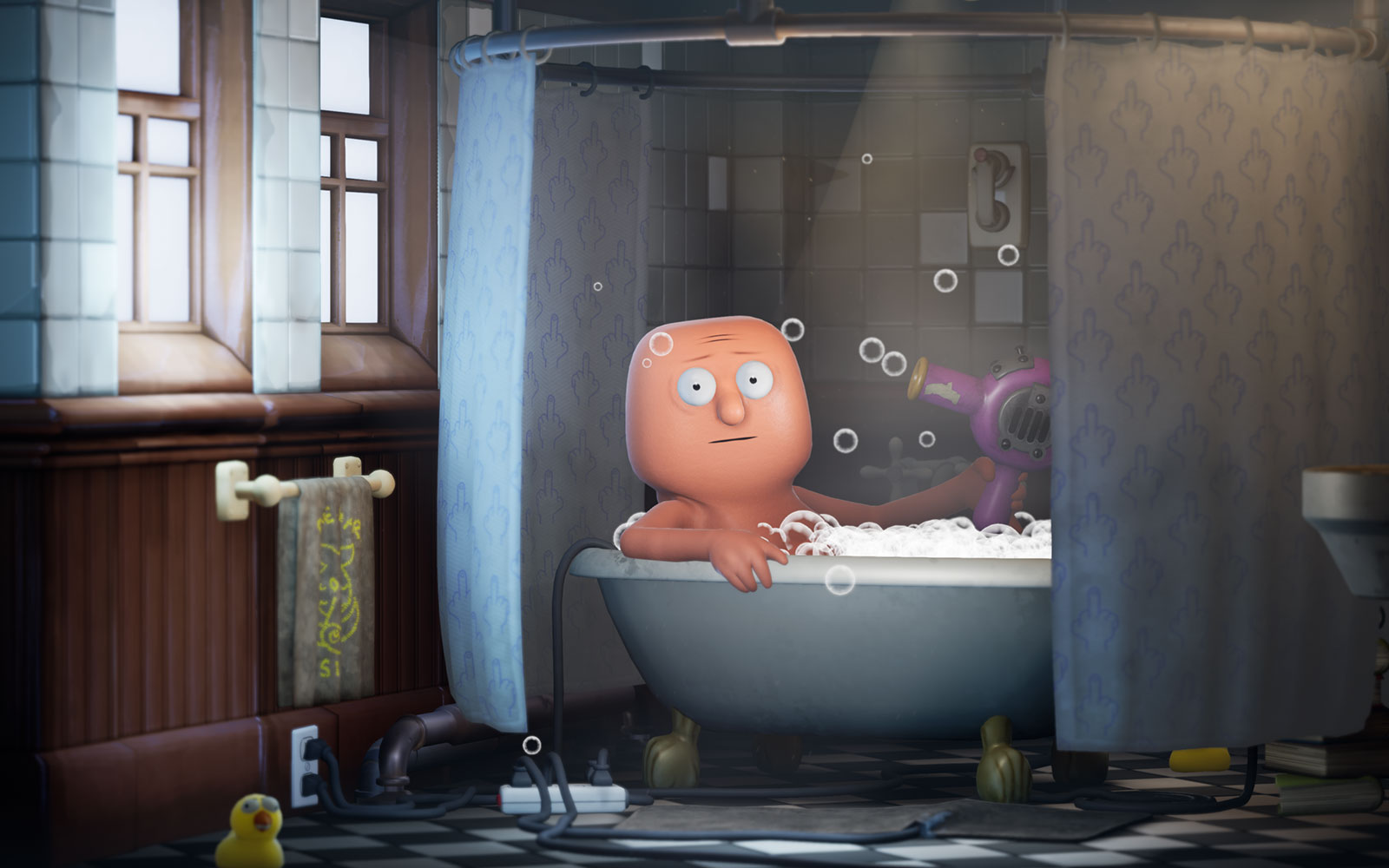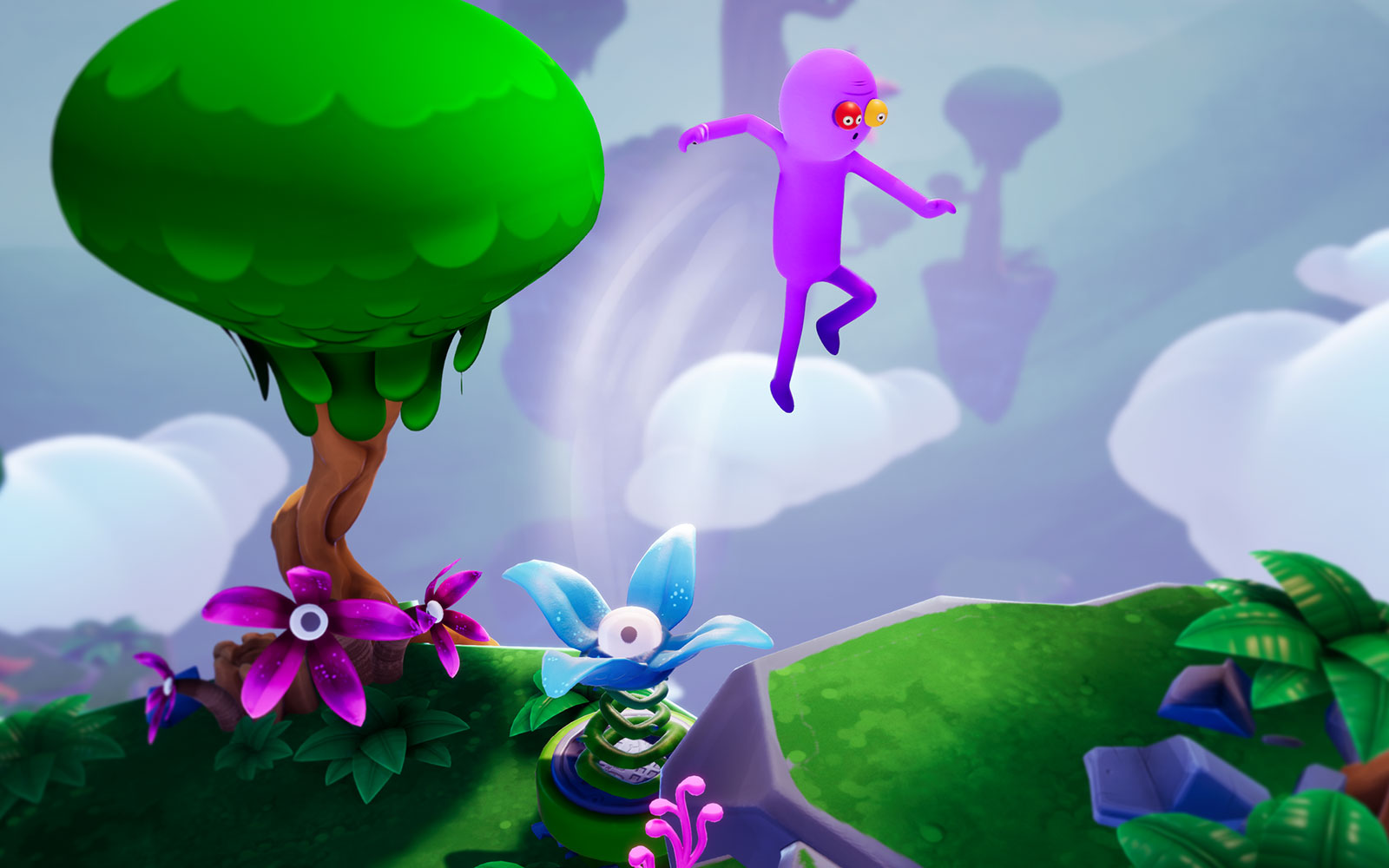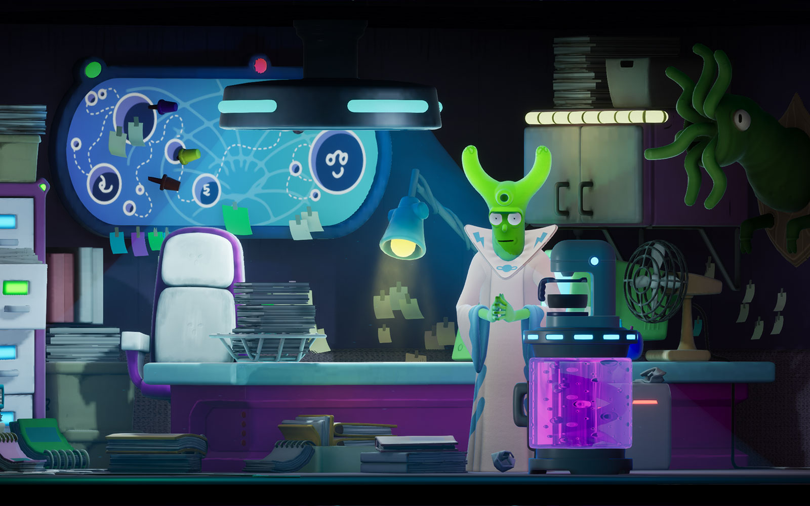 Your dogs have been dognapped by a beaked lunatic named Glorkon who stuffed them into his eye holes and is using their life essence to destroy the universe. You're partnered with Trover, a little purple eye-hole monster who isn’t a huge fan of working or being put in the position of having to save the universe. He’s also not that big a fan of you quite frankly, and neither am I. (Jk, you’re great)